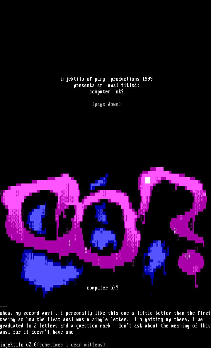 whoa, my second ansi.. i personally like this one a little better than the firstseeing as how the first ansi was a single letter. im getting up there, ive