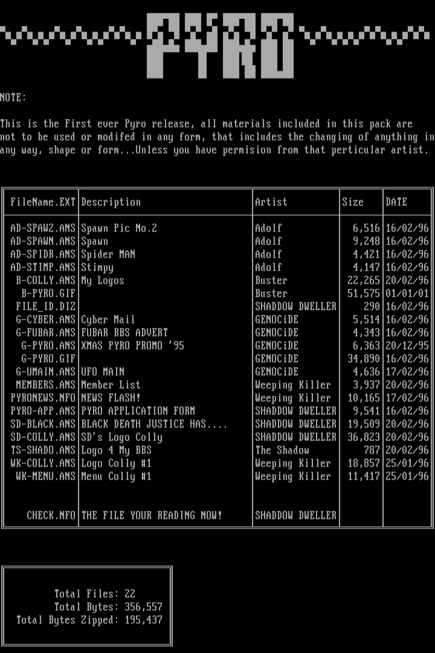 FileName.EXTDescription Artist Size DATE AD-SPAW2.ANSSpawn Pic No.2 Adolf 6,51616/02/96 AD-SPAWN.ANSSpawn Adolf 9,24816/02/96 AD-SPIDR.ANSSpider MAN Adolf 4,42116/02/96 AD-STIMP.ANSStimpy Adolf 4,14716/02/96 B-COLLY.ANSMy Logos Buster 22,26520/02/96 B-PYRO.GIF Buster 51,57501/01/01 FILEID.DIZ SHADDOW DWELLER 29016/02/96 G-CYBER.ANSCyber Mail GENOCiDE 5,51416/02/96 G-FUBAR.ANSFUBAR BBS ADVERT GENOCiDE 4,34316/02/96 G-PYRO.ANSXMAS PYRO PROMO 95 GENOCiDE 6,36320/12/95 G-PYRO.GIF GENOCiDE 34,89016/02/96 G-UMAIN.ANSUFO MAIN GENOCiDE 4,63617/02/96 MEMBERS.ANSMember List Weeping Killer 3,93720/02/96 PYRONEWS.NFONEWS FLASH! Weeping Killer 10,16517/02/96 PYRO-APP.ANSPYRO APPLICATION FORM SHADDOW DWELLER 9,54116/02/96 SD-BLACK.ANSBLACK DEATH JUSTICE HAS.... SHADDOW DWELLER 19,50920/02/96 SD-COLLY.ANSSDs Logo Colly SHADDOW DWELLER 36,82320/02/96 TS-SHADO.ANSLogo 4 My BBS The Shadow 78720/02/96 WK-COLLY.ANSLogo Colly 1 Weeping Killer 18,85725/01/96 WK-MENU.ANSMenu Colly 1 Weeping Killer 11,41725/01/96 CHECK.NFOTHE FILE YOUR READING NOW! SHADDOW DWELLER