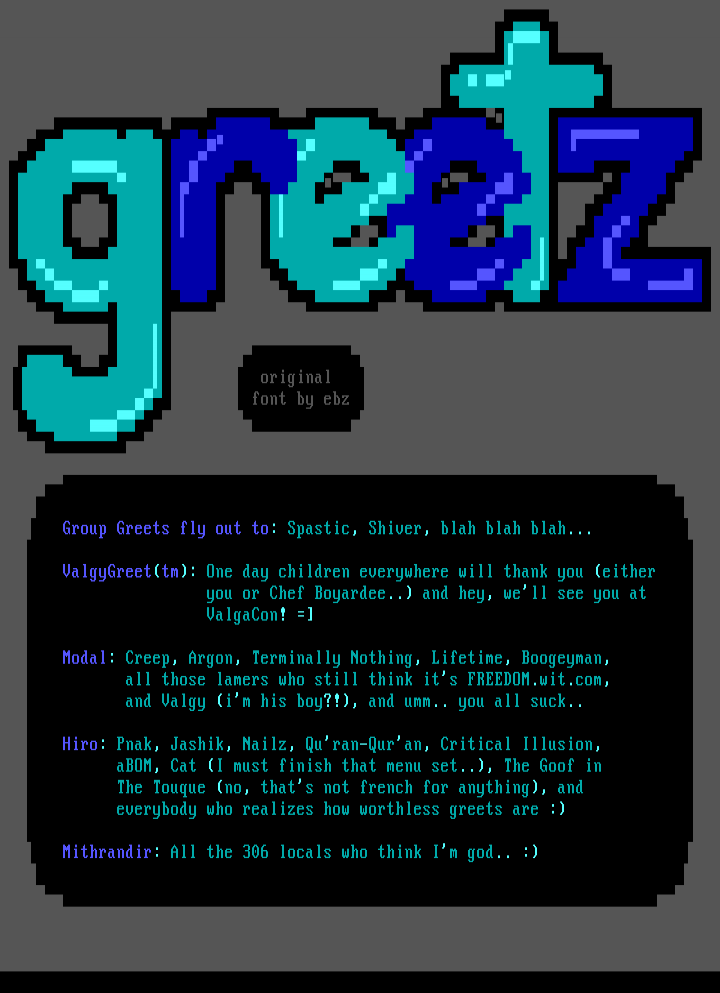 original font by ebz Group Greets fly out to: Spastic, Shiver, blah blah blah... ValgyGreettm: One day children everywhere will thank you either you or Chef Boyardee.. and hey, well see you at ValgaCon! Modal: Creep, Argon, Terminally Nothing, Lifetime, Boogeyman, all those lamers who still think its FREEDOM.wit.com, and Valgy im his boy?!, and umm.. you all suck.. Hiro: Pnak, Jashik, Nailz, Quran-Quran, Critical Illusion, aBOM, Cat I must finish that menu set.., The Goof in The Touque no, thats not french for anything, and everybody who realizes how worthless greets are : Mithrandir: All the 306 locals who think Im god.. :