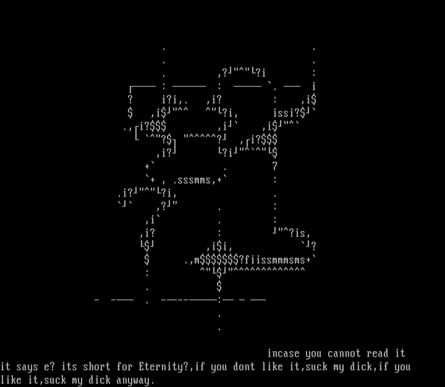 it says e? its short for Eternity?,if you dont like it,suck my dick,if you