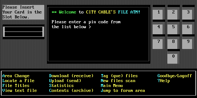 Please Insert Your Card in the ** Welcome to CITY CABLES FILE ATM! 12 3Slot Below. Please enter a pin code from the list below 4 56 7 89 0 Area Change Download receive Tag que files Goodbye/Logoff Locate a File Upload send New files scan ?Help File Titles Statistics Main Menu View text file Contents archive Jump to forum area