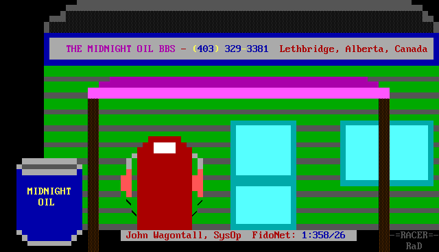 THE MIDNIGHT OIL BBS - 403 329-3381 Lethbridge, Alberta, Canada MIDNIGHT OIL / / John Wagontall, SysOpFidoNet: 1:358/26 -RACER- RaD