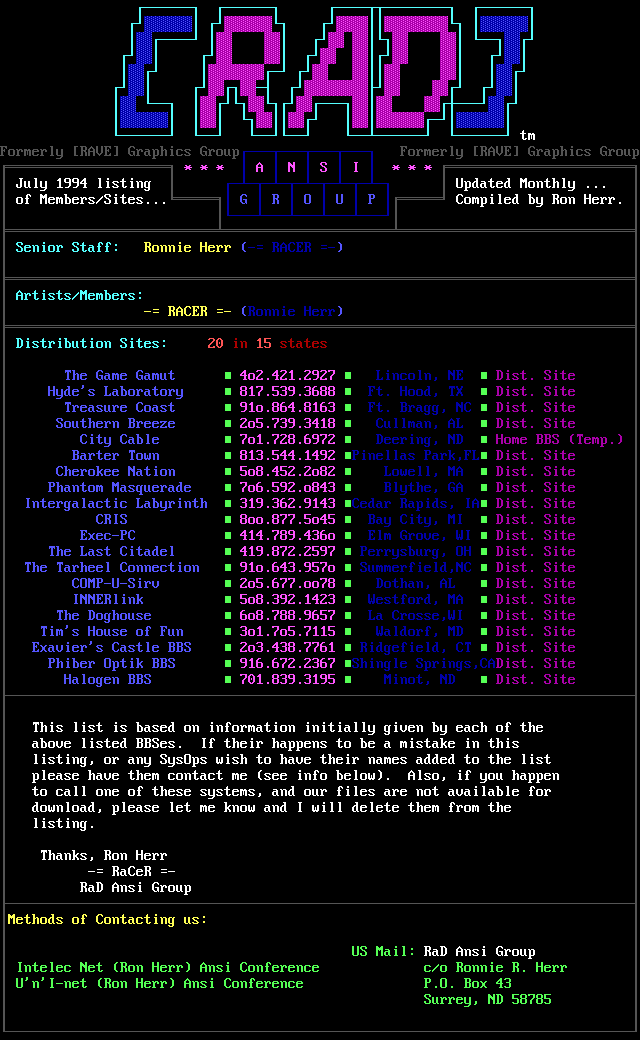 Formerly RAVE Graphics Group Formerly RAVE Graphics Group * * * A N S I * * * July 1994 listing Updated Monthly ... of Members/Sites... G R O U P Compiled by Ron Herr. Senior Staff: Ronnie Herr - RACER - Artists/Members: - RACER - Ronnie Herr Distribution Sites: 20 in 15 states The Game Gamut 4o2.421.2927 Lincoln, NE Dist. Site Hydes Laboratory 817.539.3688 Ft. Hood, TX Dist. Site Treasure Coast 91o.864.8163 Ft. Bragg, NC Dist. Site Southern Breeze 2o5.739.3418 Cullman, AL Dist. Site City Cable 7o1.728.6972 Deering, ND Home BBS Temp. Barter Town 813.544.1492 Pinellas Park,FL Dist. Site Cherokee Nation 5o8.452.2o82 Lowell, MA Dist. Site Phantom Masquerade 7o6.592.o843 Blythe, GA Dist. Site Intergalactic Labyrinth 319.362.9143 Cedar Rapids, IA Dist. Site CRIS 8oo.877.5o45 Bay City, MI Dist. Site Exec-PC 414.789.436o Elm Grove, WI Dist. Site The Last Citadel 419.872.2597 Perrysburg, OH Dist. Site The Tarheel Connection 91o.643.957o Summerfield,NC Dist. Site COMP-U-Sirv 2o5.677.oo78 Dothan, AL Dist. Site INNERlink 5o8.392.1423 Westford, MA Dist. Site The Doghouse 6o8.788.9657 La Crosse,WI Dist. Site Tims House of Fun 3o1.7o5.7115 Waldorf, MD Dist. Site Exaviers Castle BBS 2o3.438.7761 Ridgefield, CT Dist. Site Phiber Optik BBS 916.672.2367 Shingle Springs,CADist. Site Halogen BBS 701.839.3195 Minot, ND Dist. Site This list is based on information initially given by each of the above listed BBSes. If their happens to be a mistake in this listing, or any SysOps wish to have their names added to the list please have them contact me see info below. Also, if you happen to call one of these systems, and our files are not available for download, please let me know and I will delete them from the listing. Thanks, Ron Herr - RaCeR - RaD Ansi Group Methods of Contacting us: US Mail: RaD Ansi Group Intelec Net Ron Herr Ansi Conference c/o Ronnie R. Herr UnI-net Ron Herr Ansi Conference P.O. Box 43 Surrey, ND 58785