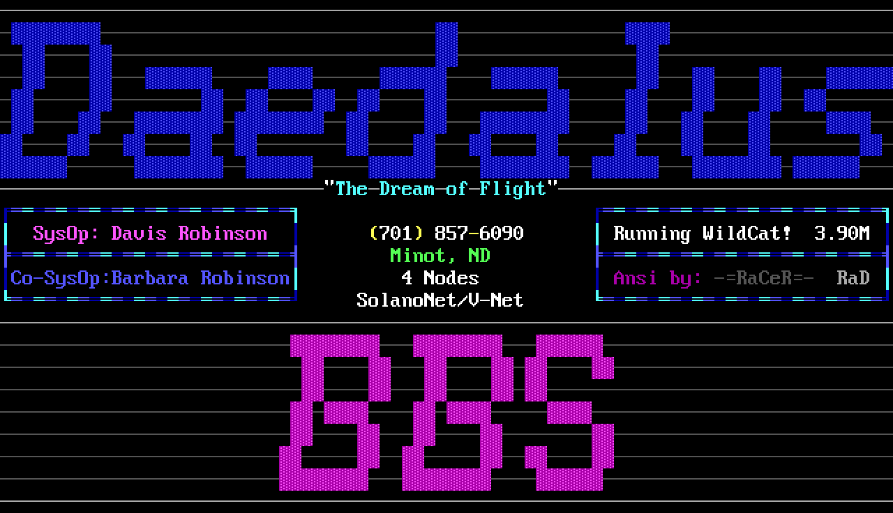 TheDreamofFlight SysOp: Davis Robinson 701 857-6090 Running WildCat! 3.90M Minot, ND Co-SysOp:Barbara Robinson 4 Nodes Ansi by: -RaCeR- RaD SolanoNet/V-Net