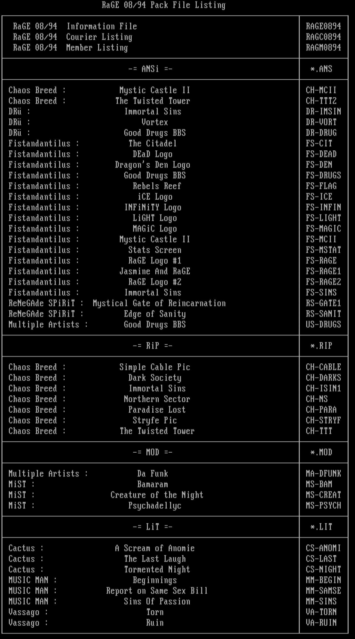 RaGE 08/94 Pack File Listing