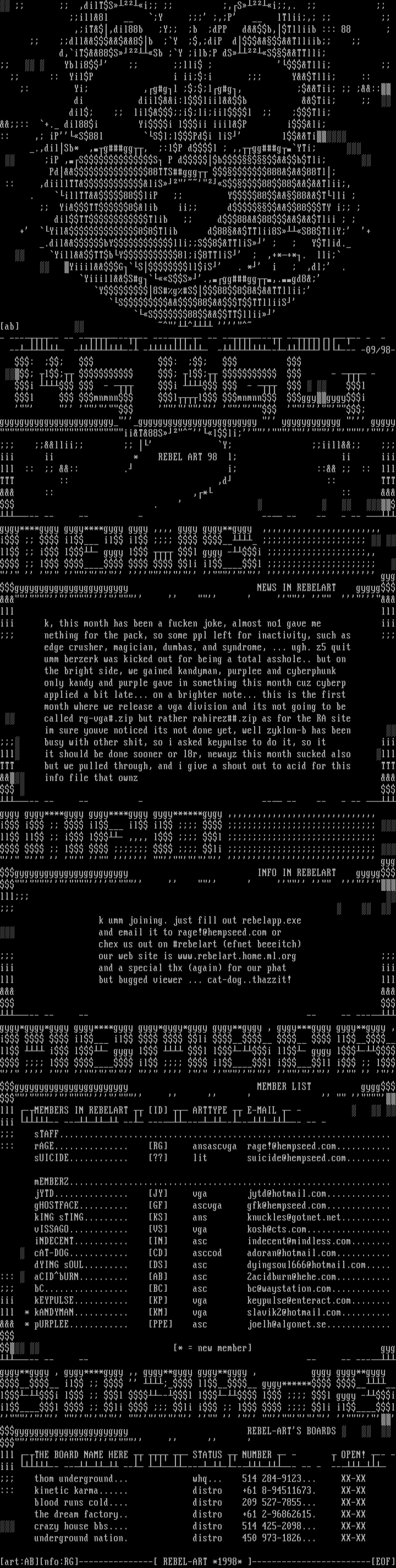 our web site is www.rebelart.home.ml.org iii and a special thx again for our phat iiilll but bugged viewer ... cat-dog..thazzit! lll --- -- -- -- -- ---gygy*gygy*gygy gygy****gygy gygy*gygy*gygy gygy**gygy , gygy***gygy gygy**gygy ,i il il li llll i l- gygy l l l-i ll- gygy l- l il ill ill i l gygygygygygygyggygygygy MEMBER LIST gygg lll -MEMBERS IN REBELART ID ARTTYPE E-MAIL - - iii -- -- -- ------------ -- -