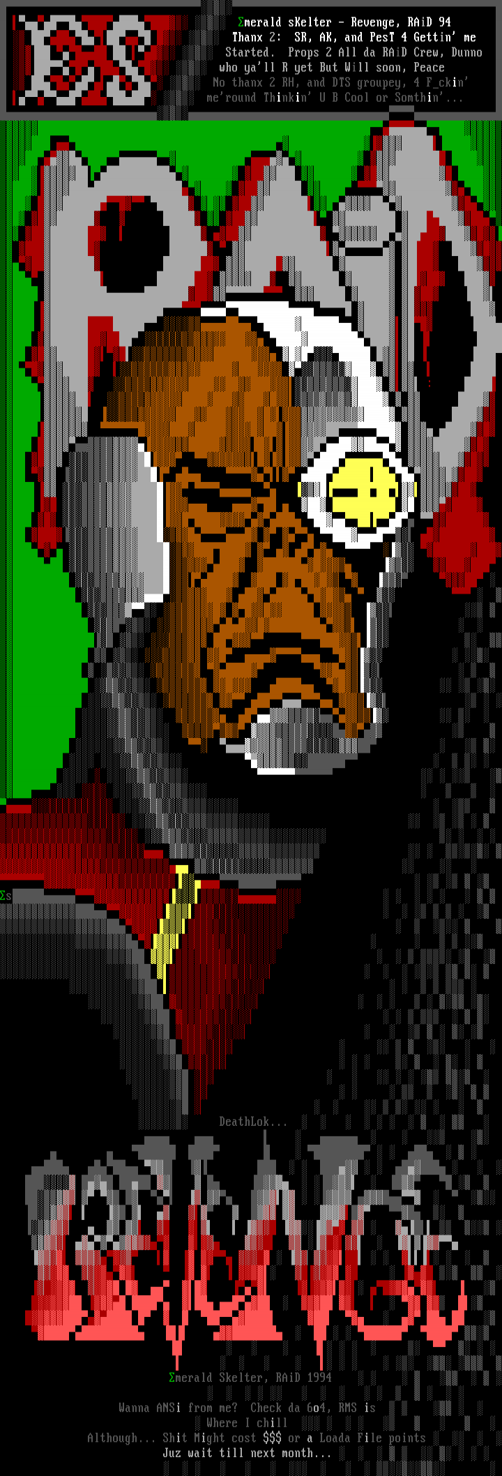 merald sKelter - Revenge, RAiD 94 Thanx 2: SR, AK, and PesT 4 Gettin me Started. Props 2 All da RAiD Crew, Dunno who yall R yet But Will soon, Peace No thanx 2 RH, and DTS groupey, 4 Fckin meround Thinkin U B Cool or Somthin...