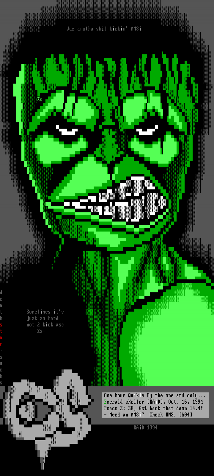 h just so hard s not 2 kick ass t -s- a r s u c k s One hour Quikie By the one and only... merald sKelter RAiD, Oct. 16, 1994 Peace 2: SR, Get back that damn 14.4! - Need an ANSi? Check RMS, 604 RAiD 1994