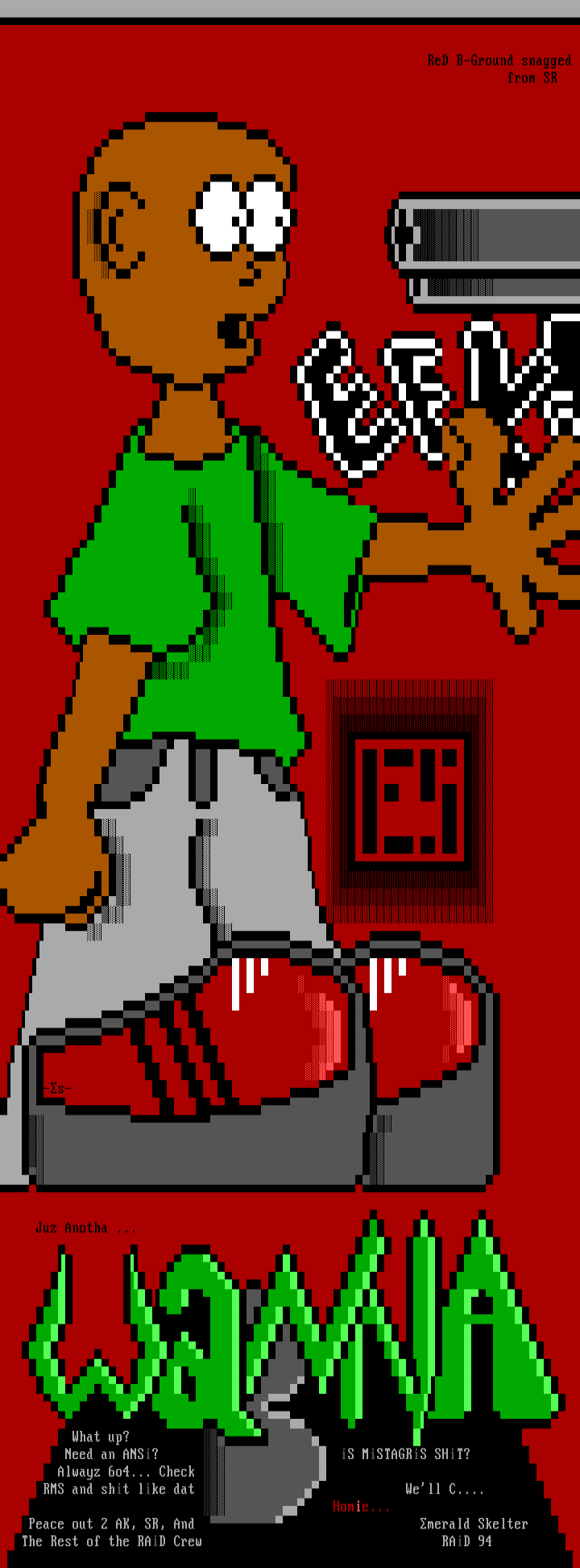 -s- Juz Anotha ... What up? Need an ANSi? iS MiSTAGRiS SHiT? Alwayz 6o4... Check RMS and shit like dat Well C.... Homie... Peace out 2 AK, SR, And merald Skelter The Rest of the RAiD Crew RAiD 94