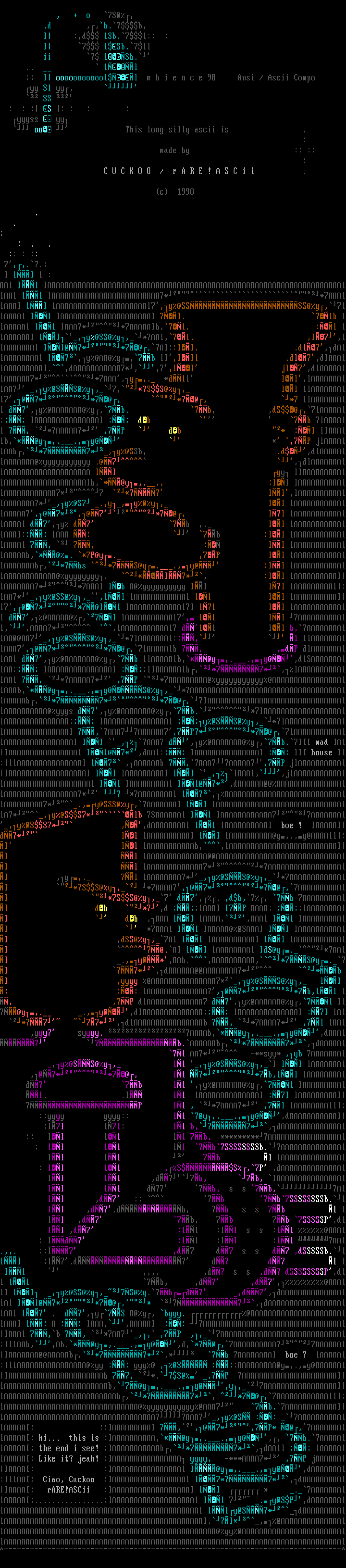 : :: l7,@7**7b,ll l, ,7P dl7 d7,y@@y,7l ll7@y,. .,y@,dl::: ll :7l ll *77 77*,dlb 7, *77* ,7l ll ,yyy7 syyyy. 7b,*@y,..,y@,dl7 7b.b,*77*,dl 7l 7* -**syy* ,yb 7l ,y@SS@y, ll ,y@SS@y,l ll ll ,@7**7@, ll 7**7b,ll ll d7 7b ll ,y@@y,7l ll l. .l ll ll :7l ll 7P ll , *77* ,7l lll: ::yyyy yyyy:: ll 7@y,..,y@,dl :l7l l7l: ll b,77*,dl :: ll ll ll 7b, *********7l : ll ll ll 7b7SSSSSSSSb.7l ll ll 7b l ll : ll ll ,SS,7P ,dl ll ll ,d77b, 7b, ll ll ll d77 7b, s s 7b,7l ll ,d7 :: 7b 7b7SSSSSSSSb.l ll ,d7.db, 7b s s 7b l l ll ,d7 7b, 7b 7b 7SSSSSP,dl ll ,d7 :ll :ll s s :ll @l : ld7 :ll :ll :ll 7l.,,. ::l7 ,d7 d7 s s d7 ,dSSSSSb.lll :l7.d7 d7 d7 l l ll ,,,. ,d7 s s ,d7 dSSSSSSSSP,dll ll 7b, ,d7 ,d7,@lll ll ,y@SS@y,7S@y.7bd7 ,d7,dlll ll@7**7@,* 77,dlll l7 . d7,y7S @y, byyy. @lll l: :: l,,l :: 7lll 7,b 7, *77,, ,7P ,,7l:llb,,b.*@y,..,y@,d,*7@,777ll@@b,*77*.* 7b 7l boe ? ll:ll@yy :: yyy@ ,@S :::@y,.,y@llb 77, *.7S@ ,7P 7llb,7@y,..,y@,y,7llb,*77*, *7@,7ll:l@yyyyyyyyyyy@7 7b.7ll777,y@S :: 7ll: ::l 7,,@7*,7P* @,7ll: hi... this is :,*@y,..,y@,, 7b.7ll: the end i see! :b,*77*,dll :: lll: Like it? jeah! : yyyy, -***7* ,7P jl: :l l@y,..,y@,dl:ll: Ciao, Cuckoo :l l7*77*,dll: rARE!ASCii :l ll * .7ll:................:l ll 7 .y@SP,dlll lly@S7*dlll.7l*,@ll@yy@lll