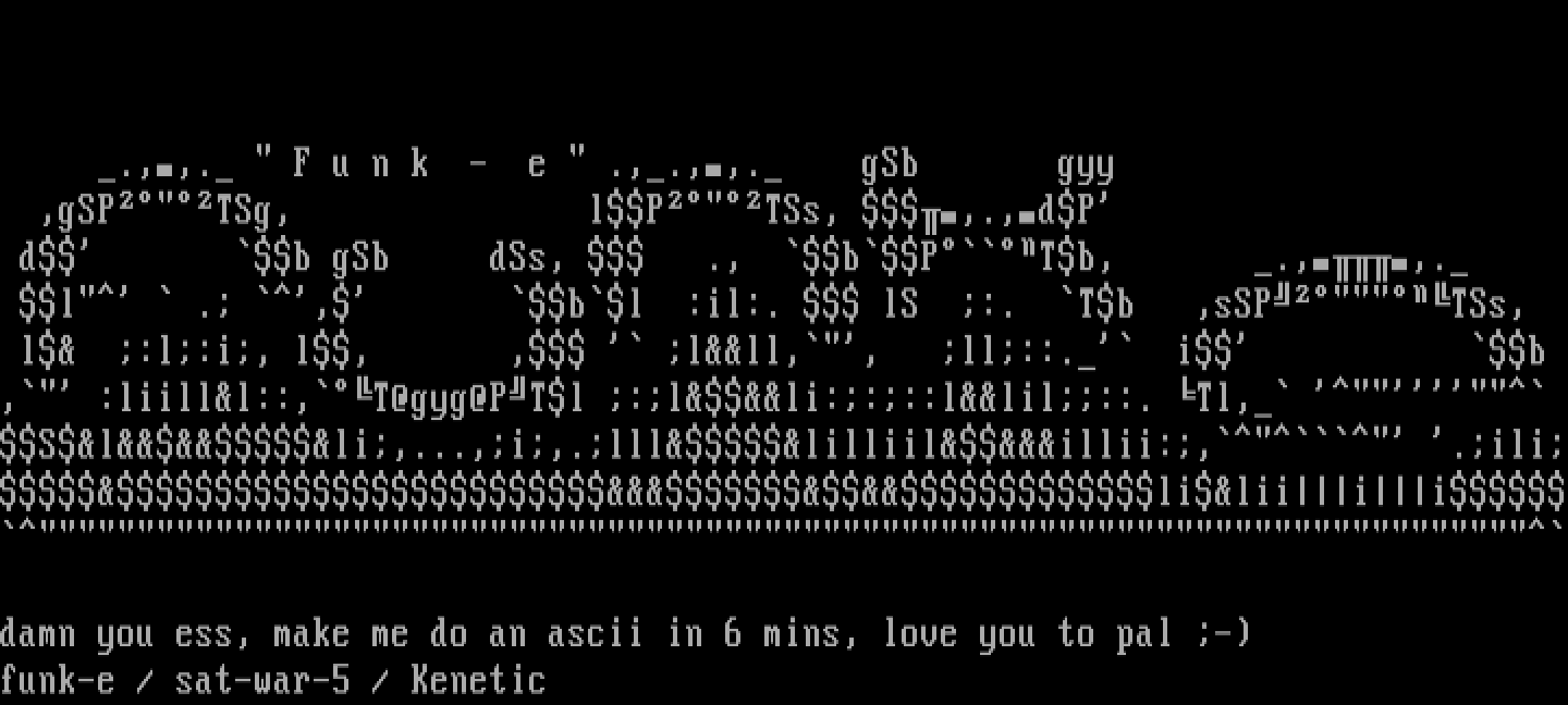 damn you ess, make me do an ascii in 6 mins, love you to pal -