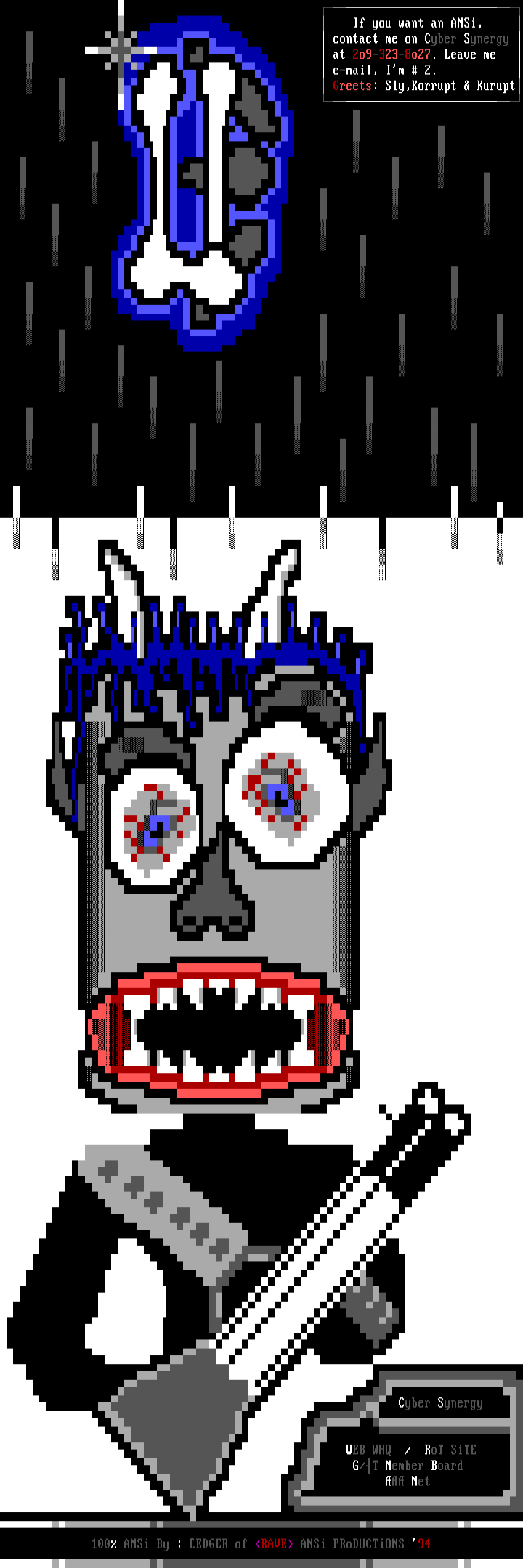 If you want an ANSi, contact me on Cyber Synergy at 2o9-323-8o27. Leave me e-mail, Im 2. Greets: Sly,Korrupt Kurupt