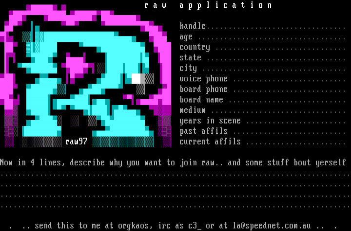 country .............................. state ................................ city ................................. voice phone .......................... board phone .......................... board name ........................... medium ............................... years in scene ....................... past affils .......................... raw97 current affils .......................