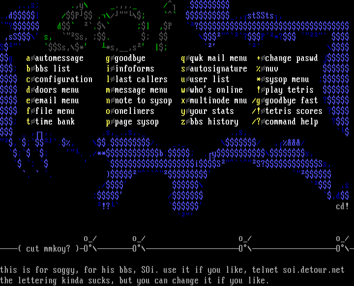 this is for soggy, for his bbs, SOi. use it if you like, telnet soi.detour.net