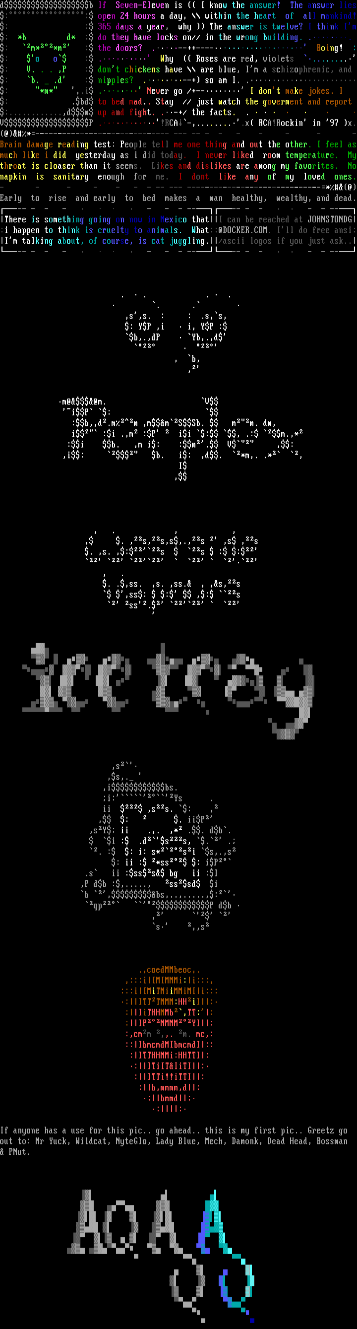 : m**m : the doors? .--++---- Boing! :: o o : . Why Roses are red, violets ........: V. . . ,P : dont chickens have are blue, Im a schizophrenic, and : b. .d : nipples? .--+ so am I. .: *m* ,.i . Never go /+-- I dont make jokes. I : .bd to bed mad.. Stay // just watch the goverment and report :............,dm up and fight. .-+/ the facts. . VP .!RCA-,.........x RCA!Rockin in 97 x.@*------------------------------ --- -- - - - - - - -Brain damage reading test: People tell me one thing and out the other. I feel asmuch like i did yesterday as i did today. I never liked room temperature. Mythroat is cloaser than it seems. Likes and dislikes are among my favorites. Nonapkin is sanitary enough for me. I dont like any of my loved ones.- - - - - - - -- --- ------------------------------*@Early to rise and early to bed makes a man healthy, wealthy, and dead.--- - - - - - - ---- - - - - --There is something going on now in Mexico thatI can be reached at JOHNSTONDG:i happen to think is cruelty to animals. What::@DOCKER.COM. Ill do free ansi:Im talking about, of course, is cat juggling./ascii logos if you just ask..--- - - - - - - ---- - - - - --