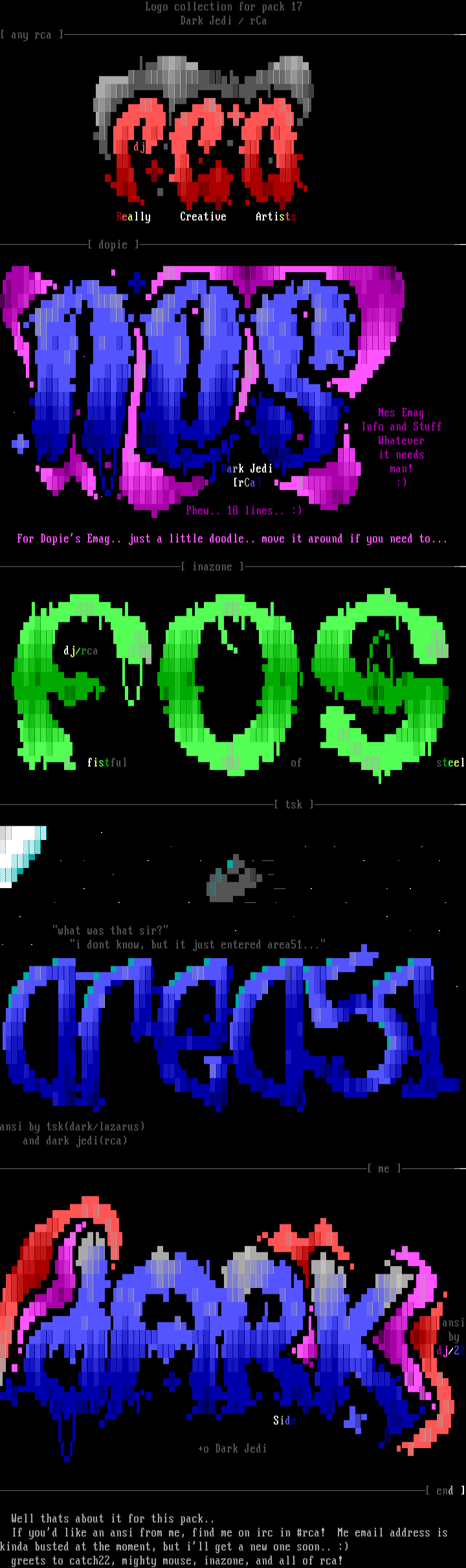 If youd like an ansi from me, find me on irc in rca! Me email address is kinda busted at the moment, but ill get a new one soon.. :