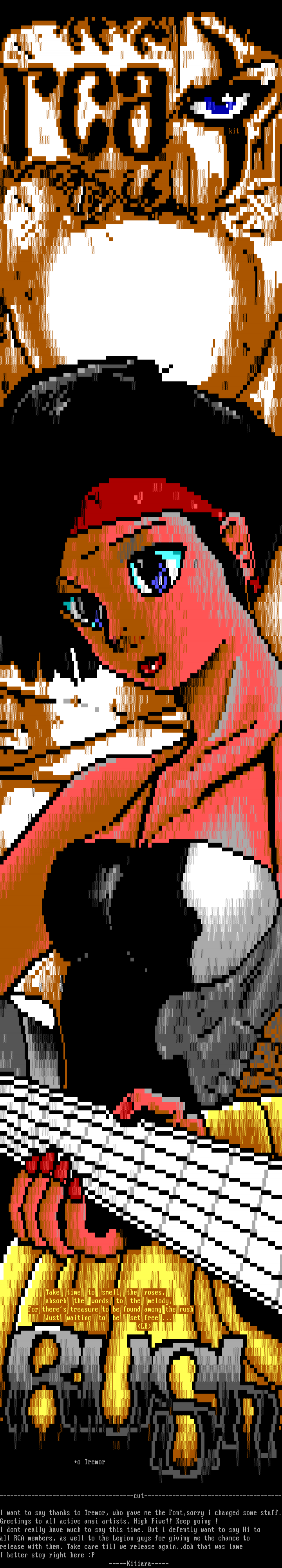 I want to say thanks to Tremor, who gave me the Font,sorry i changed some stuff.Greetings to all active ansi artists. High Five!! Keep going !