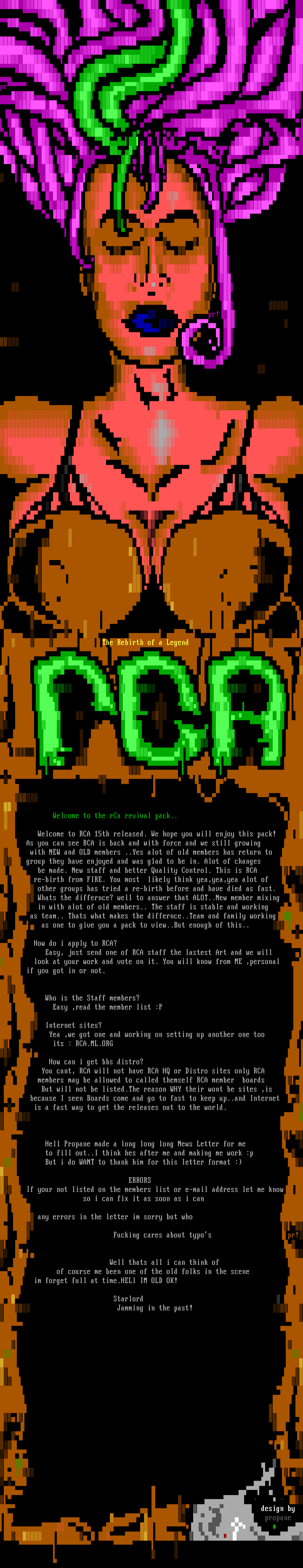 its : RCA.ML.ORG How can i get bbs distro? You cant, RCA will not have RCA HQ or Distro sites only RCA members may be allowed to called themself RCA member boards But will not be listed.The reason WHY their wont be sites ,is because I seen Boards come and go to fast to keep up..and Internet is a fast way to get the releases out to the world.