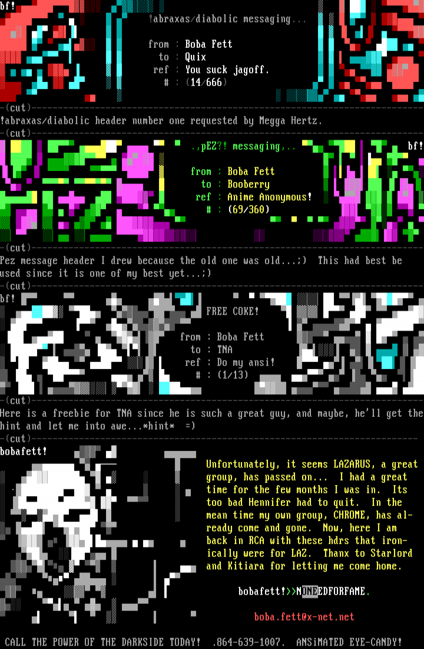 -cut-------------------------------------------------------------------------- .,pEZ?! messaging,.. bf! from : Boba Fett to : Booberry ref : Anime Anonymous! : 69/360 -cut--------------------------------------------------------------------------Pez message header I drew because the old one was old... This had best be
