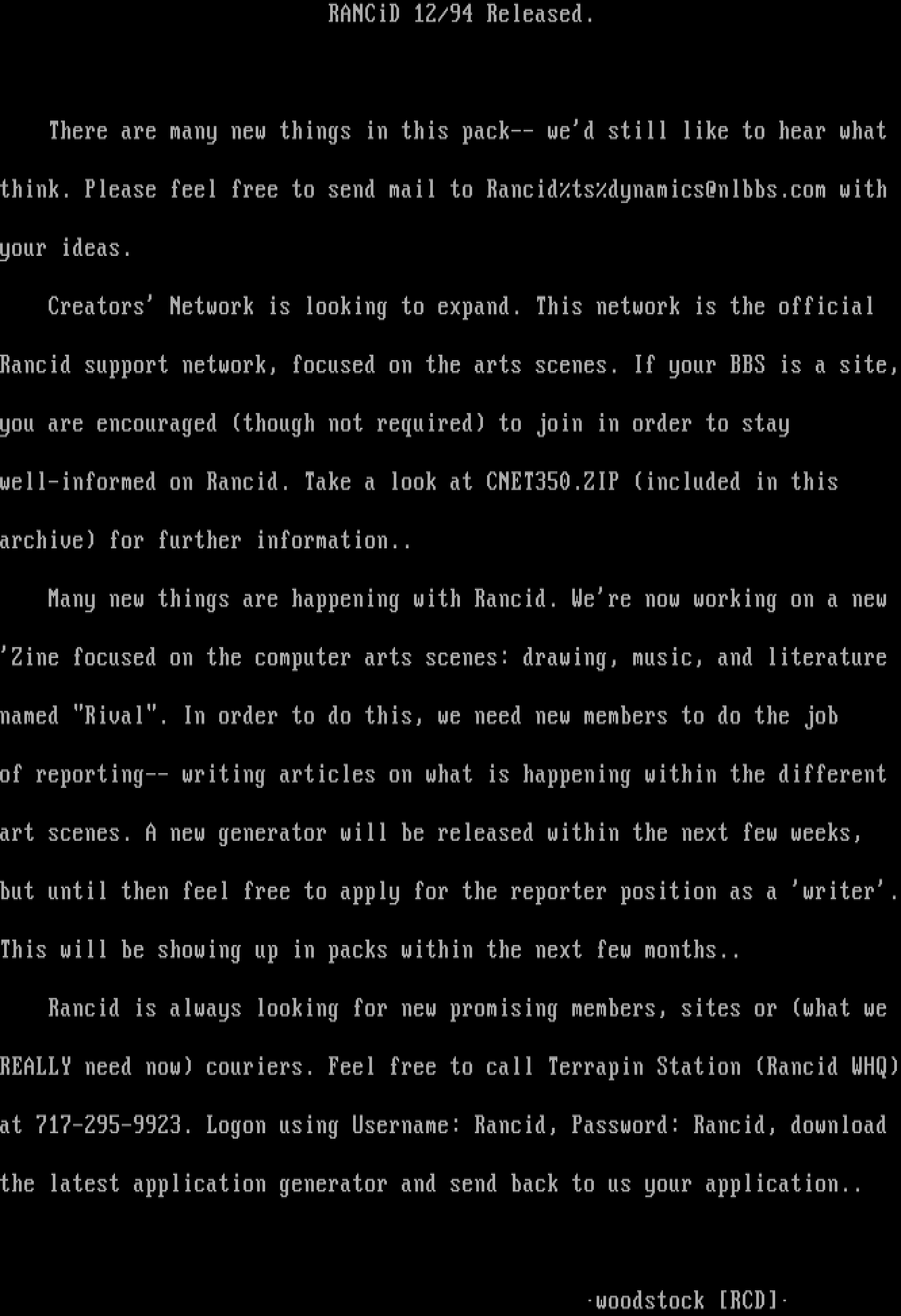 Rancid support network, focused on the arts scenes. If your BBS is a site,