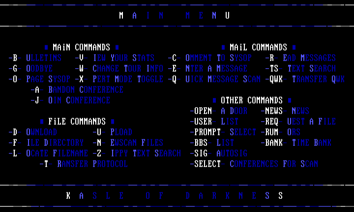 -O- PAGE SYSOP -X- PERT MODE TOGGLE -Q- UICK MESSAGE SCAN -QWK- TRANSFER QWK