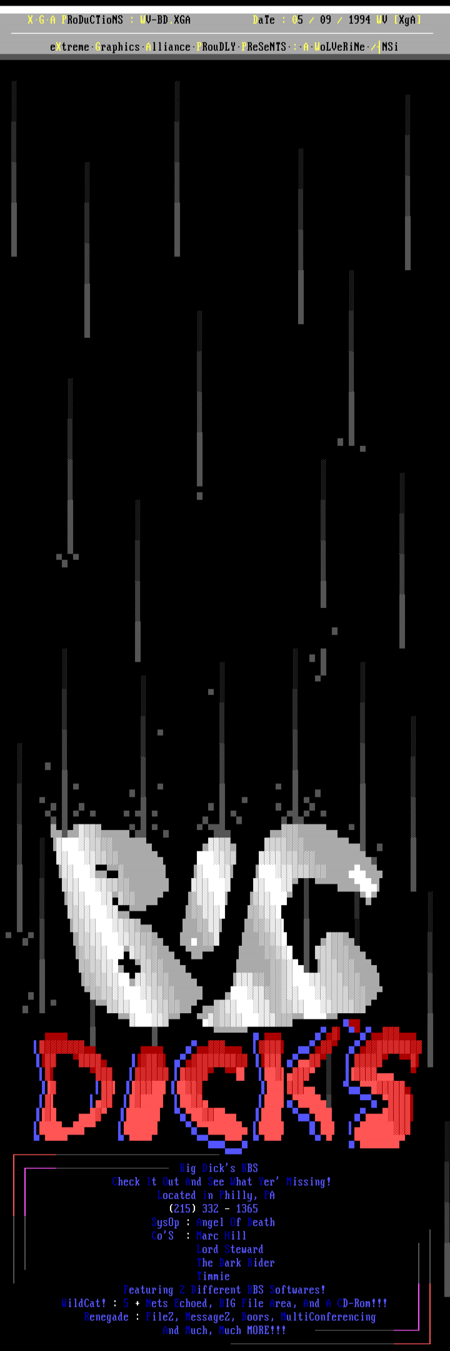 Big Dicks BBS Check It Out And See What Yer Missing! Located in Philly, PA 215 332 - 1365 SysOp : Angel Of Death CoS : Marc Hill Lord Steward The Dark Rider Timmie Featuring 2 Different BBS Softwares! WildCat! : 5 + Nets Echoed, BIG File Area, And A CD-Rom!!!