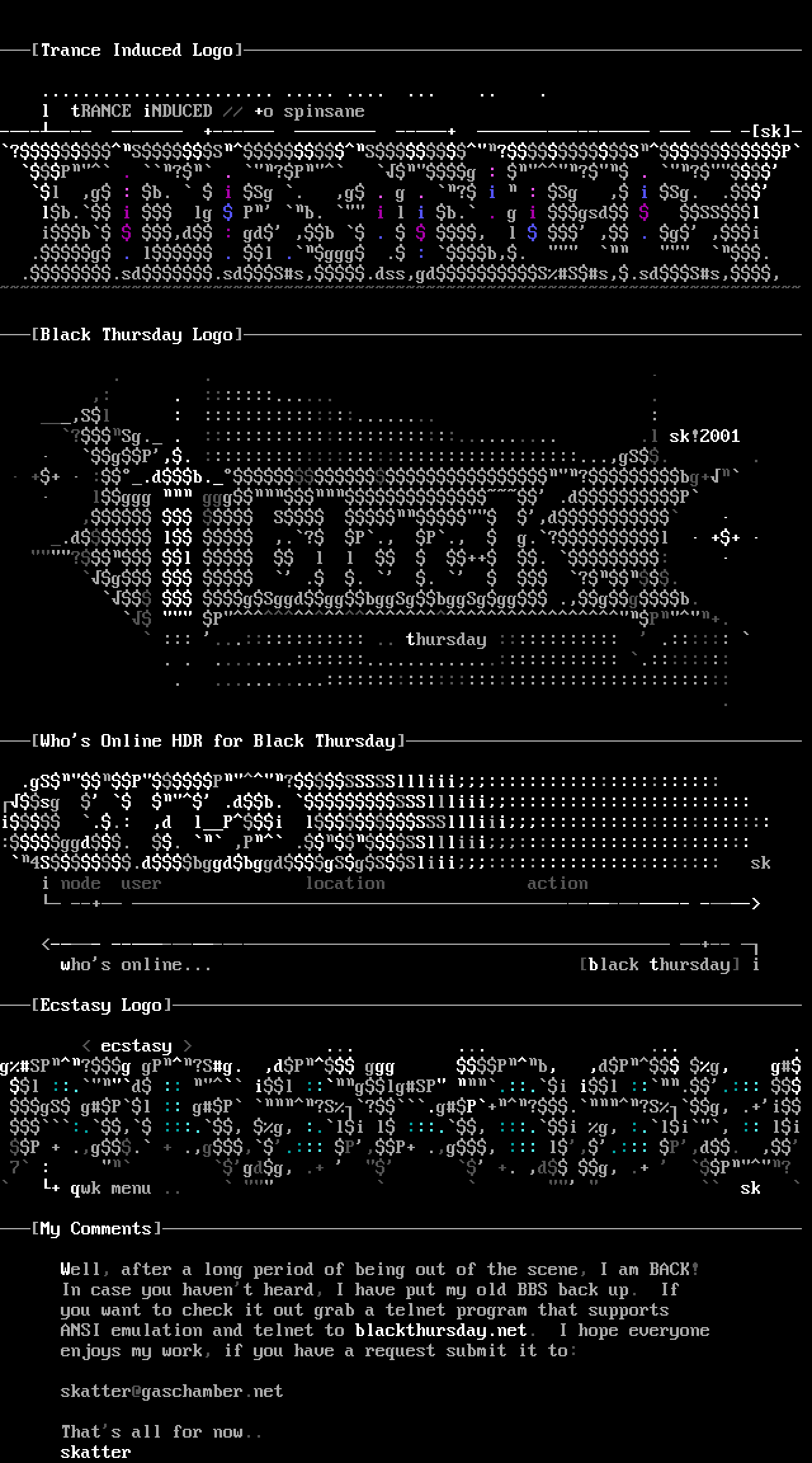 ANSI emulation and telnet to blackthursday.net. I hope everyone