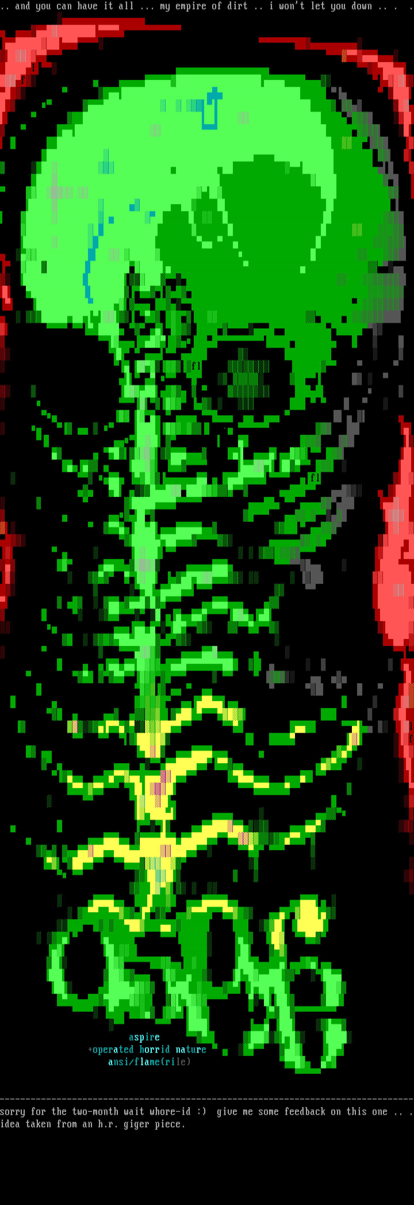 --------------------------------------------------------------------------------sorry for the two-month wait whore-id : give me some feedback on this one .. .idea taken from an h.r. giger piece.