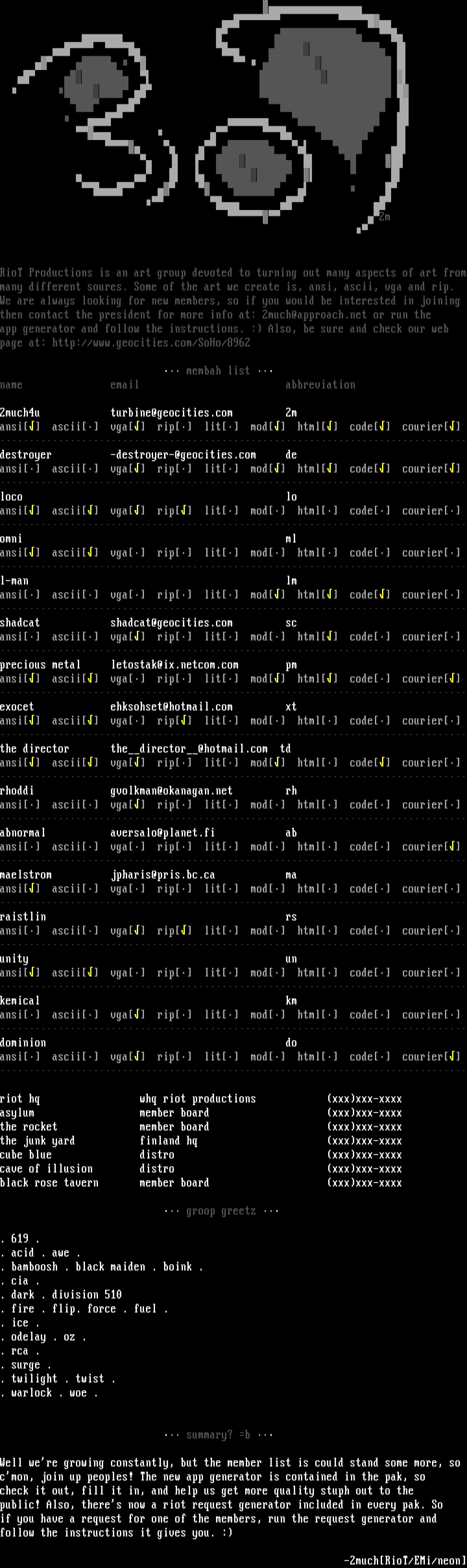 RioT Productions is an art group devoted to turning out many aspects of art frommany different soures. Some of the art we create is, ansi, ascii, vga and rip.