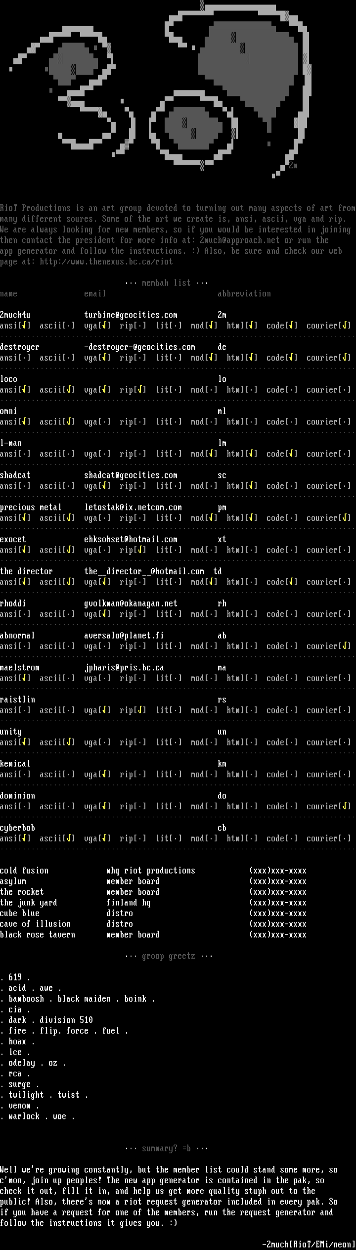 RioT Productions is an art group devoted to turning out many aspects of art frommany different soures. Some of the art we create is, ansi, ascii, vga and rip.