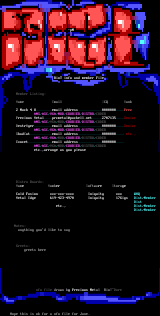 RioT info and member File Member Listing: Name Email ICQ Rank 2 Much 4 U........email address............0000000....Prez ANS/ASC/VGA/MOD/COURIER/DISTRO/CODER Precious Metal....prcmetal@pacbell.net.....2707135....Senior ANS/ASC/VGA/MOD/COURIER/DISTRO/CODER Destr0yer.........email address............0000000....Senior ANS/ASC/VGA/MOD/COURIER/DISTRO/CODER ShadCat...........email address............0000000.... etc., ANS/ASC/VGA/MOD/COURIER/DISTRO/CODER Exocet............email address............0000000.... ANS/ASC/VGA/MOD/COURIER/DISTRO/CODER etc.,arrange as you please