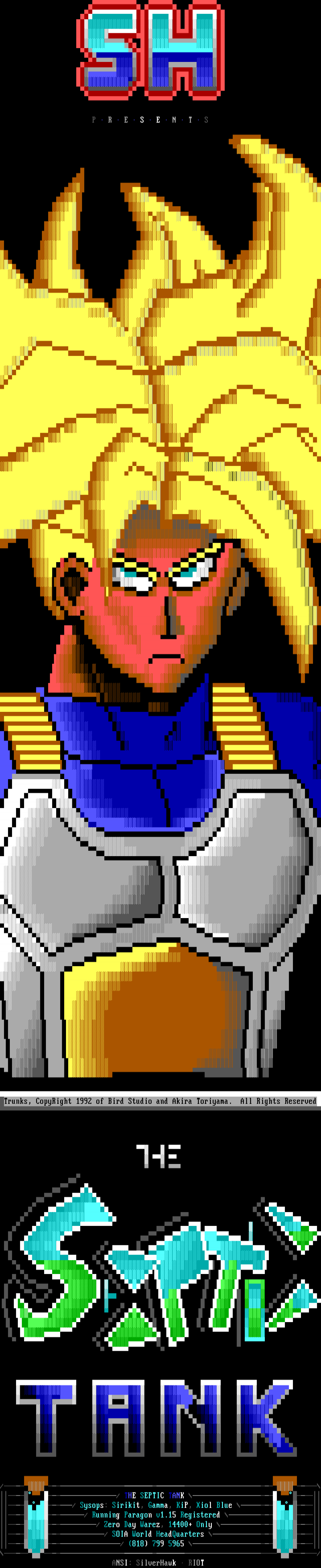 / / THE SEPTIC TANK / Sysops: Sirikit, Gamma, KiP, Xiol Blue / Running Paragon v1.15 Registered / Zero Day Warez, 14400+ Only / SOIA World HeadQuarters / 818 799 5965 / ANSI: SilverHawk RIOT
