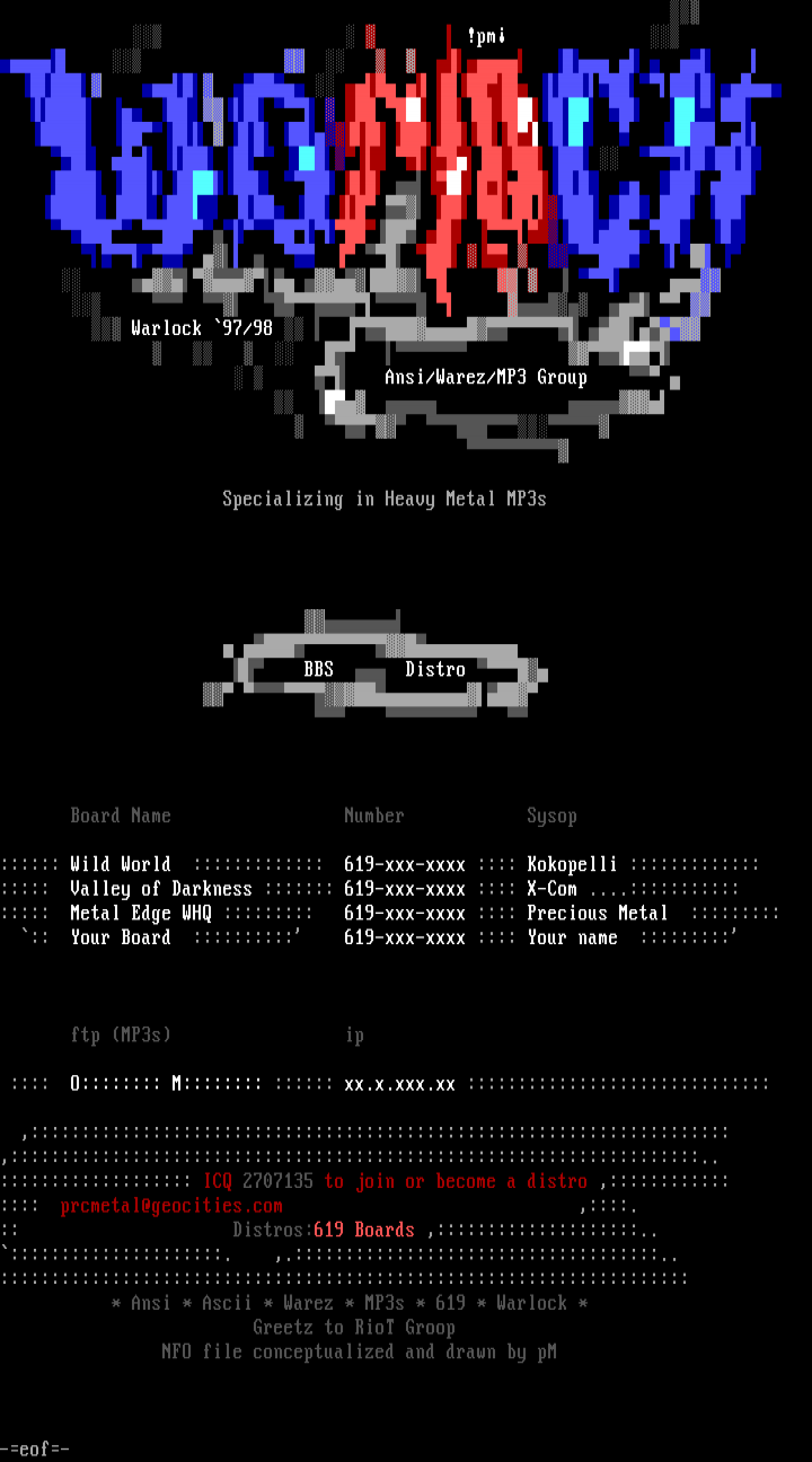 * Ansi * Ascii * Warez * MP3s * 619 * Warlock *