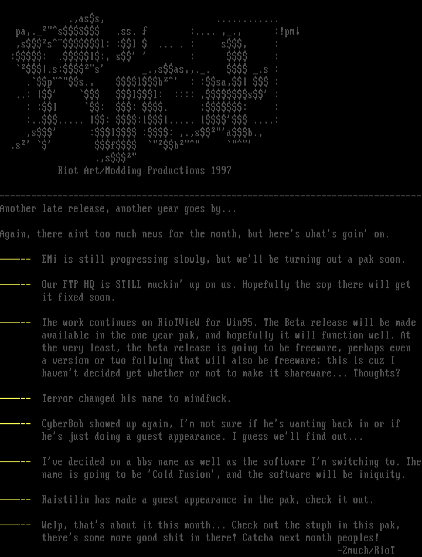 --- Ive decided on a bbs name as well as the software Im switching to. The name is going to be Cold Fusion, and the software will be iniquity.
