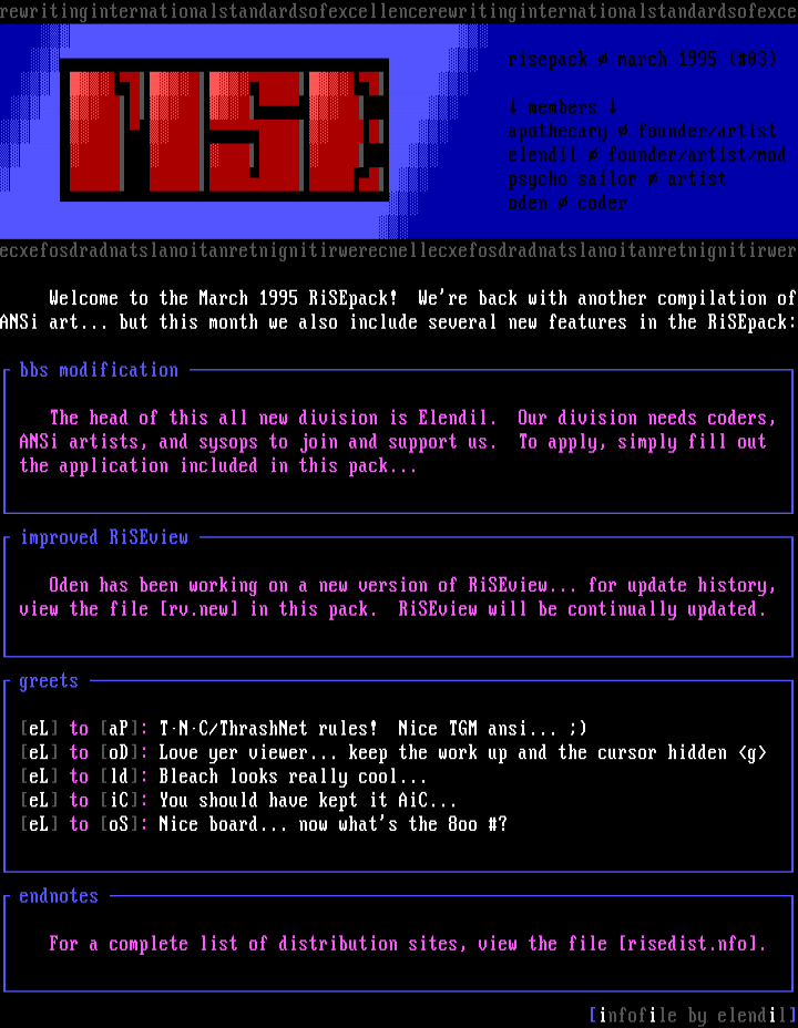atslanoitanretnignitirwer Welcome to the March 1995 RiSEpack! Were back with another compilation ofANSi art... but this month we also include several new features in the RiSEpack: bbs modification