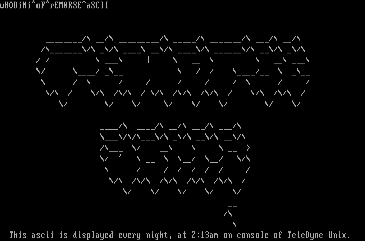 This ascii is displayed every night, at 2:13am on console of TeleDyne Unix.