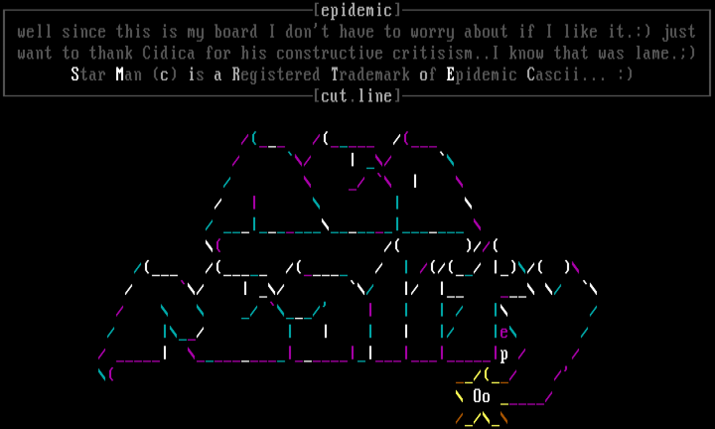 epidemic well since this is my board I dont have to worry about if I like it.: just want to thank Cidica for his constructive critisism..I know that was lame. Star Man c is a Registered Trademark of Epidemic Cascii... : cut.line