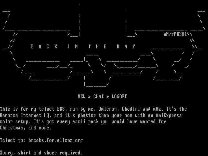 This is for my telnet BBS, run by me, Omicron, Whodini and mHz. Its the