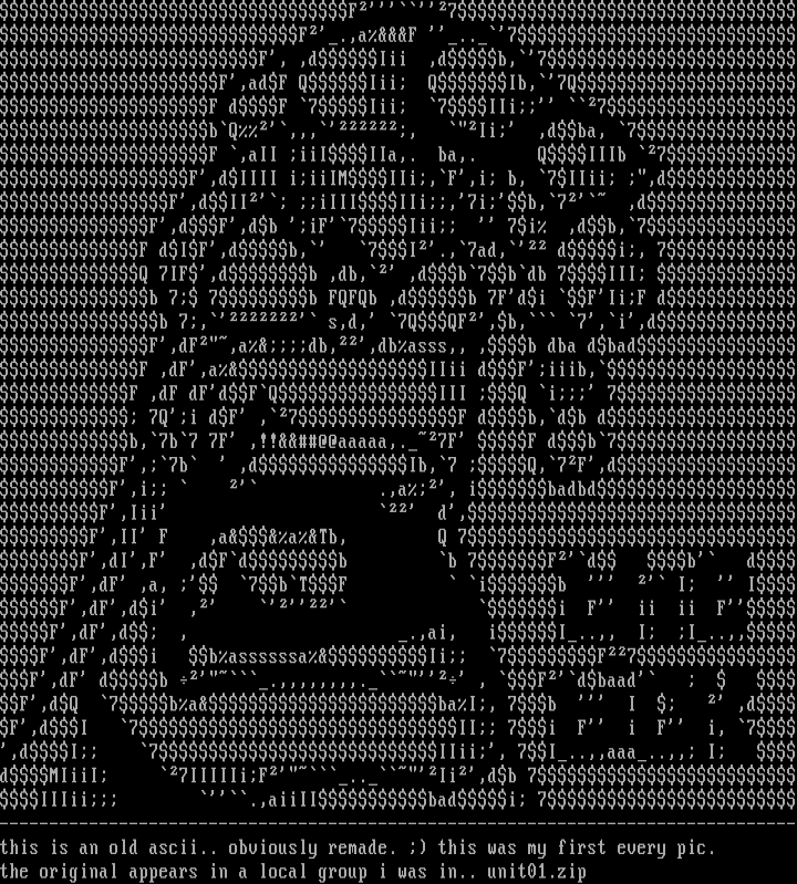 F7F.,aF ..7F, ,dIii ,db,7F,adF QIii QIb,7QF dF 7Iii 7IIi 7bQ,,,, Ii ,dba, 7F ,aII iiIIIa,. ba,. QIIIb 7F,dIIII iiiIMIIi,F,i b, 7IIii ,dF,dII iIIIIIi,7ib,7 ,dF,dF,db iF7Iii 7i ,db,7F dIF,db, 7I.,7ad, di, 7Q 7IF,db ,db, ,db7bdb 7III b 7 7b FQFQb ,db 7Fdi FIiF db 7, s,d, 7QQF,b, 7,i,dF,dF,adb,,dbasss,, ,b dba dbadF ,dF,aIIii dFiiib,F ,dF dFdFQIII Q i 7 7Qi dF ,7F db,db db,7b7 7F ,!!@@aaaaa,.7F F db7F,7b ,dIb,7 Q,7F,dF,i .,a, ibadbdF,Iii d,F,II F ,aaTb, Q 7F,dI,F ,dFdb b 7Fd b dF,dF ,a, 7bTF ib I IF,dF,di , i F ii ii FF,dF,d , .,ai, iI..,, I I..,,F,dF,di bassssssaIi 7F7F,dF db .,,,,,,,,. , Fdbaad F,dQ 7babaI, 7b I ,dF,dI 7II 7i F i F i, 7,dI 7IIii, 7I..,,aaa..,, I dMIiiI 7IIIIIiF..Ii,db 7IIIii .,aiiIIbadi 7--------------------------------------------------------------------------------this is an old ascii.. obviously remade. this was my first every pic.