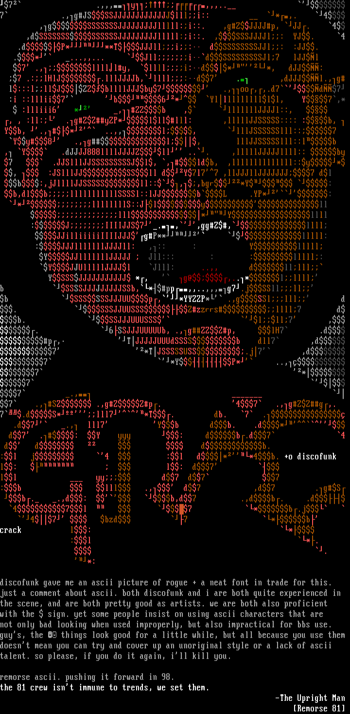 discofunk gave me an ascii picture of rogue + a neat font in trade for this.