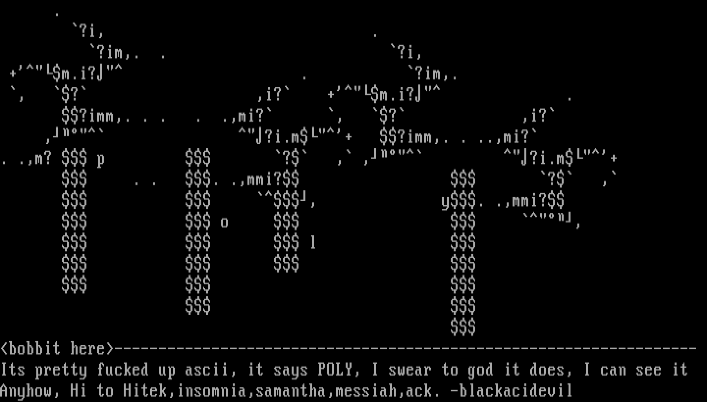 Its pretty fucked up ascii, it says POLY, I swear to god it does, I can see it