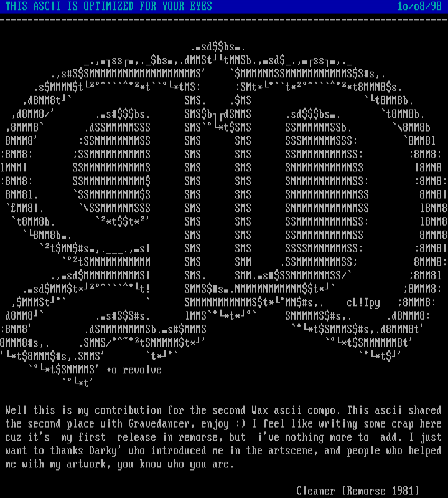 Well this is my contribution for the second Wax ascii compo. This ascii shared