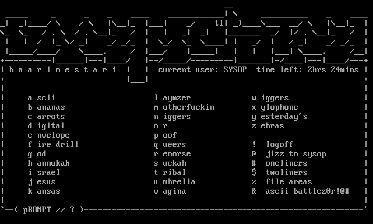 / / / tl / / . / . / / / . / / / / / / / / / / // . / / . / +-------------/ --//----------/---/---+ b a a r i m e s t a r i current user: SYSOP time left: 2hrs 24mins +------------------------------------------------------------------------+ a scii l aymzer w iggers b ananas m otherfuckin x ylophone c arrots n iggers y esterdays d igital o r z ebras e nvelope p oof f ire drill q ueers ! logoff g od r emorse @ jizz to sysop h annukah s uckah oneliners i srael t ribal twoliners j esus u mbrella file areas k ansas v agina ascii battlez0r!@ -- pROMPT // ? ------------------------------------------------------------