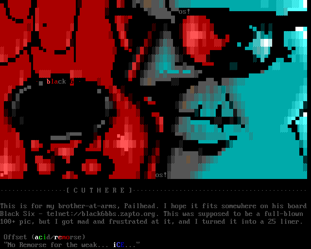 This is for my brother-at-arms, Pailhead. I hope it fits somewhere on his board Black Six - telnet://black6bbs.zapto.org. This was supposed to be a full-blown