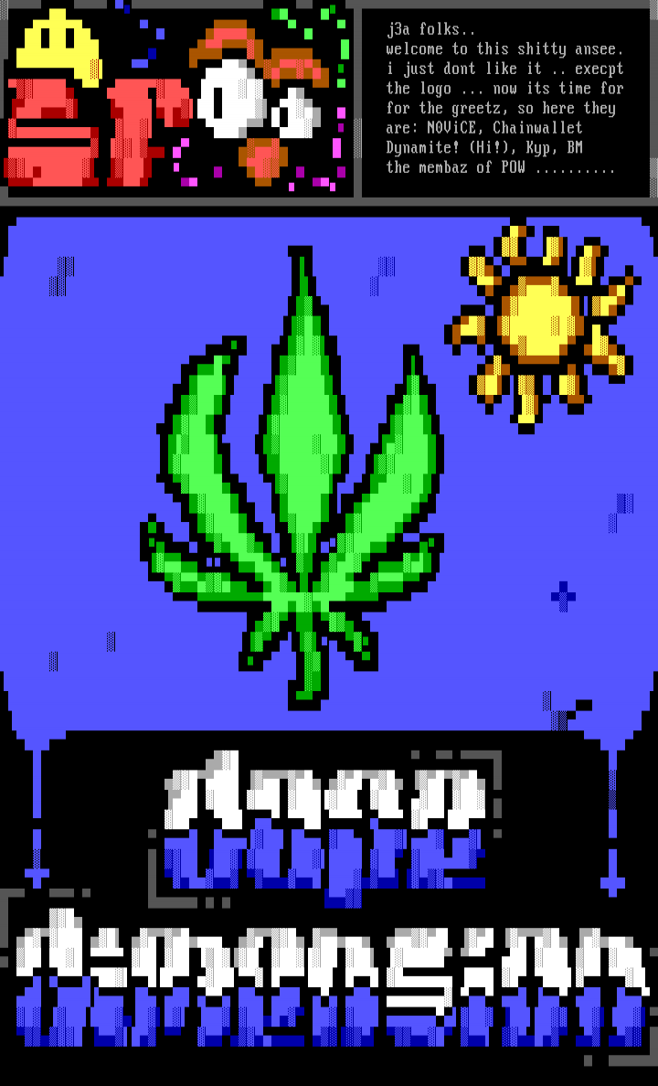 j3a folks.. welcome to this shitty ansee. i just dont like it .. execpt the logo ... now its time for for the greetz, so here they are: N0ViCE, Chainwallet Dynamite! Hi!, Kyp, BM the membaz of POW ..........