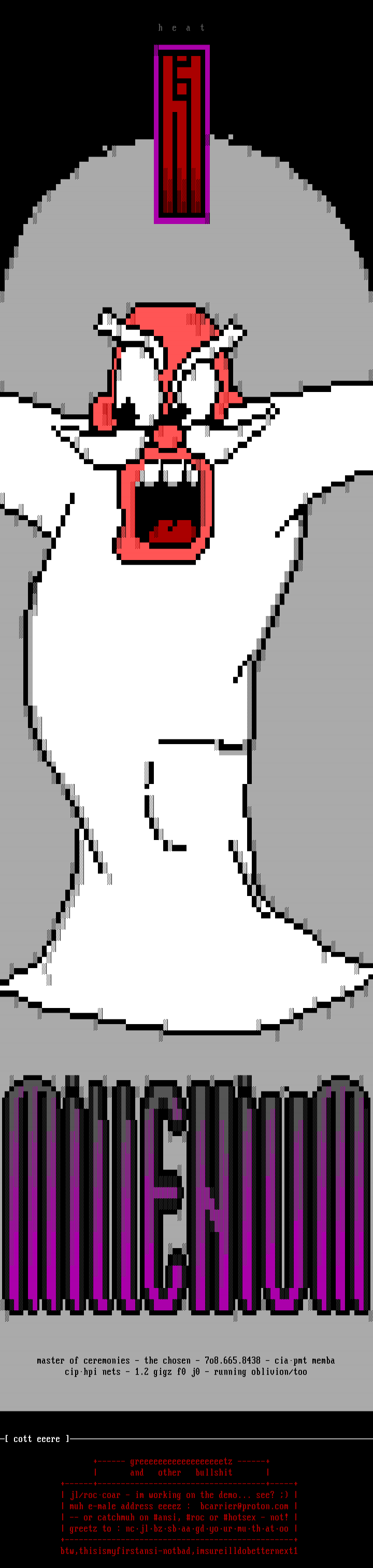 cott eeere +------ greeeeeeeeeeeeeeeeeetz------+ andotherbullshit+------+------------------------------------+-----+ jl/roccoar - im working on the demo... see? muh e-male address eeeez :bcarrier@proton.com -- or catchmuh on ansi, roc or hotsex - not! greetz to : ncjlbzsbaagdyourmuthatoo+-------------------------------------------------+btw,thisismyfirstansi-notbad,imsureilldobetternext1