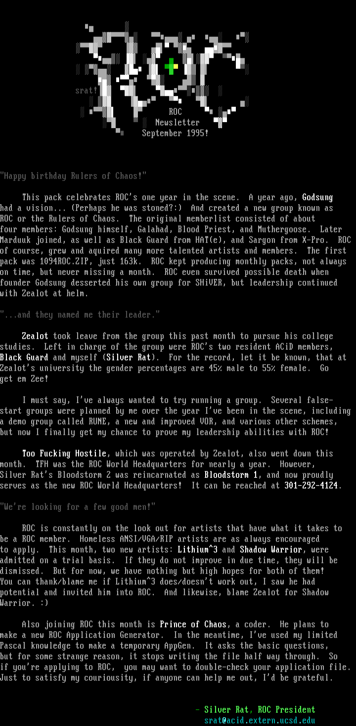 be a ROC member. Homeless ANSI/VGA/RIP artists are as always encouraged