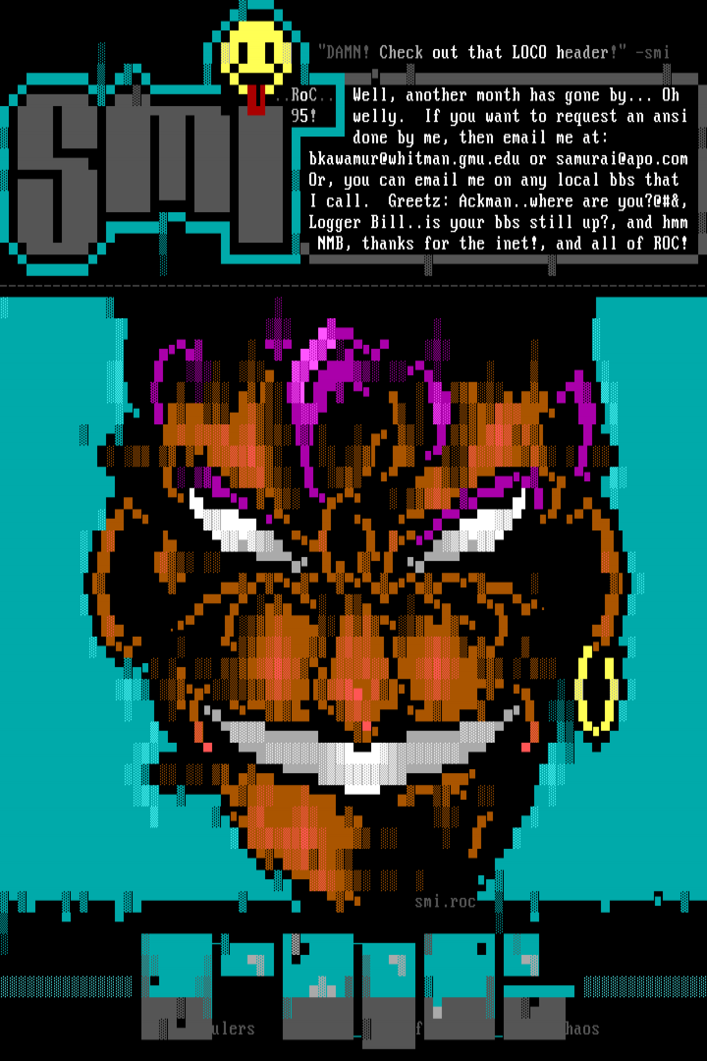 ..RoC.. Well, another month has gone by... Oh 95! welly. If you want to request an ansi done by me, then email me at: bkawamur@whitman.gmu.edu or samurai@apo.com Or, you can email me on any local bbs that I call. Greetz: Ackman..where are you?@, Logger Bill..is your bbs still up?, and hmm NMB, thanks for the inet!, and all of ROC!