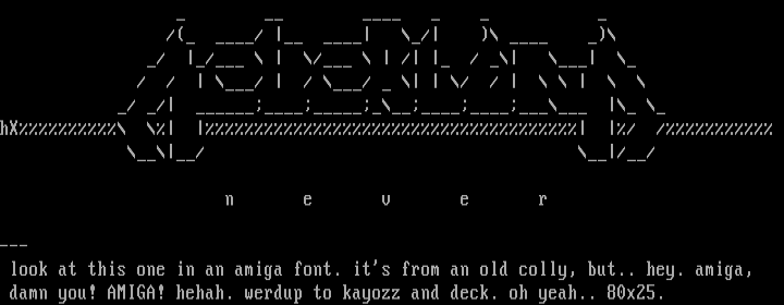 damn you! AMIGA! hehah. werdup to kayozz and deck. oh yeah.. 80x25.