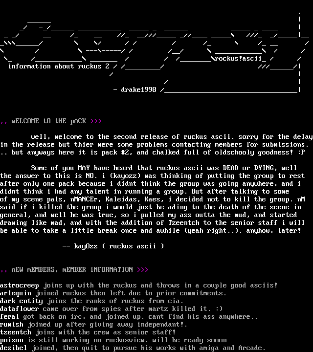 well, welcome to the second release of ruckus ascii. sorry for the delayin the release but thier were some problems contacting members for submissions.
